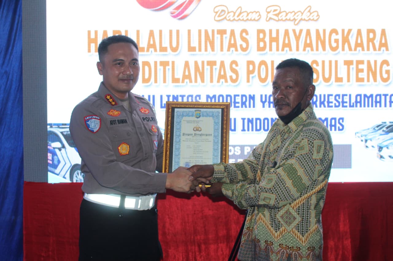 Dalam momentum tersebut, Ditlantas Polda Sulteng memberikan penghargaan kepada Arsyid, seorang warga yang menghibahkan tanah pribadinya untuk pembangunan Pos PJR Lalombi bentuk nyata dukungan masyarakat terhadap peningkatan fasilitas lalu lintas.